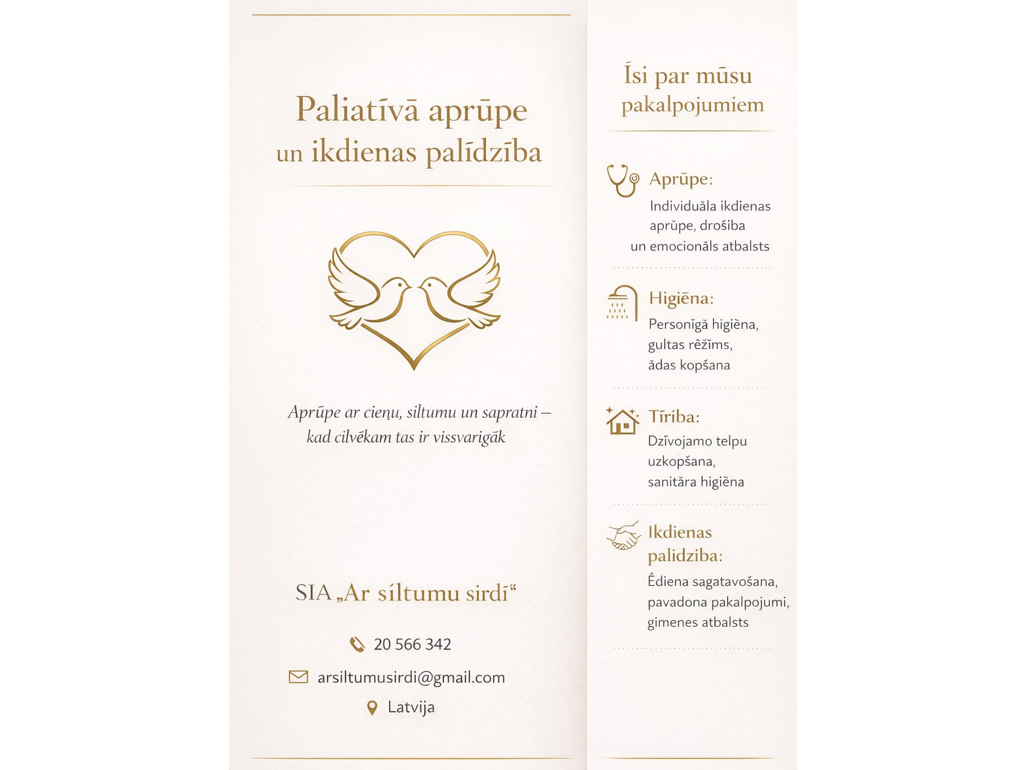 ООО "Ar Siltumu Sirdī" это компания, предлагающая широкий спектр услуг по уходу и уборке по всей Латвии, уделяя особое внимание эмоциональным и практическим потребностям своих клиентов. Компания специализируется на оказании паллиативной помощи, помогая пациентам, нуждающимся в особом уходе и поддержке на заключительном этапе жизни. Мы также предлагаем индивидуальный ежедневный уход, который включает помощь в соблюдении гигиены, приготовлении пищи и выполнении домашних обязанностей. Наши услуги также включают в себя общение и эмоциональную поддержку, чтобы клиенты чувствовали себя в безопасности и окруженными заботой в своих собственных домах.
